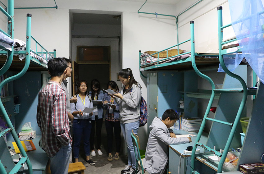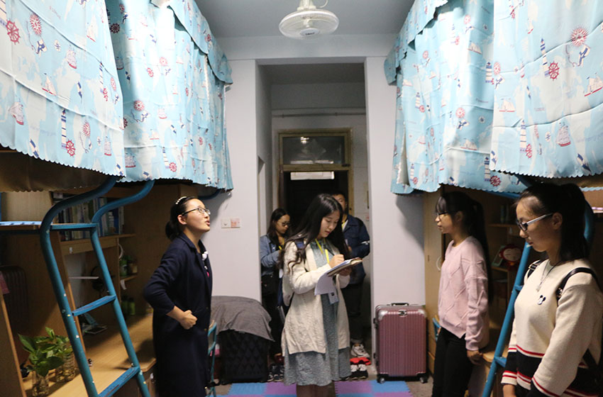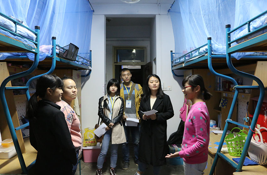 下午五点四十,评选正式开始,评委的打分评比主要依据寝室名称与徽章设计、寝室内部设计、寝室设计解说三方面。寝室经过同学们精心设计,风格迥异但各有千秋。有的宿舍在墙壁上饰以花样不同的各色图案,有的宿舍张贴各色壁纸打造不同的风格感觉,更有宿舍有心灵手巧者齐心折叠千纸鹤、打造寝室照片集,让寝室中充盈着家一般的温馨气息。评选过程中,寝室推选的解说员为评委详细介绍灵感来源、设计涵义,评委们细心聆听后也都进行了点评并给出了自己的建议。