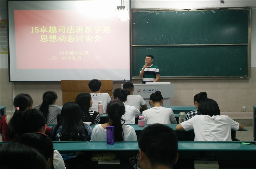 15卓越司法班响应公司号召,积极了解员工的学习生活等方面的思想动态。 9月22日下午,15卓司在2020104教室召开了新学期思想动态讨论会,会议由班长刘闯主持。