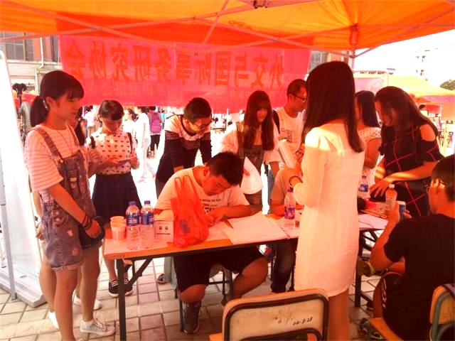 上午七点,社团全体工作人员提前到达场地,开始紧张进行悬挂会旗、横幅和粘贴宣传海报等准备工作。九点,工作人员已布置好咨询台,招新活动正式开始。针对大一新生,社团首先通过发宣传单、宣讲等形式向他们简单介绍了本社团的宗旨、部门设置等相关内容。其次也有很多大一新生积极主动到展台处咨询,表示对我社很感兴趣,希望能够进一步了解精品活动。在工作人员耐心详细地讲解后,他们觉得外交社团能够锻炼并提升自己工作和人际交往的能力,主动要求加入会员并竞争理事。由于社团在招新前做了充分的准备,虽然现场报名火爆,但仍井然有序。