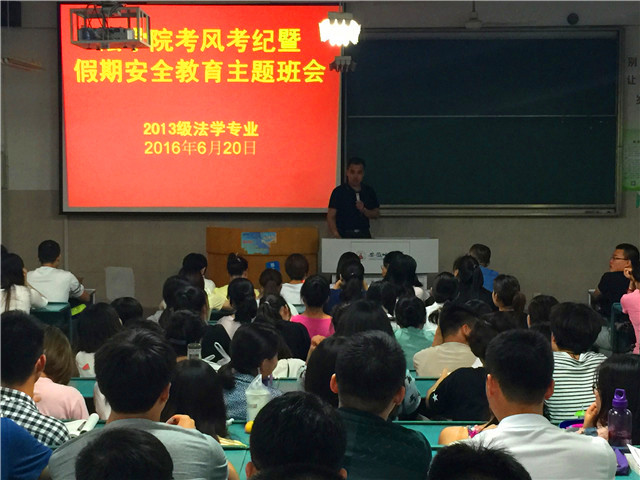 6月20日晚上七点,2013级法学专业在教室2020102召开考风考纪暨假期安全教育主题班会。本次班会由13法学辅导员陈兴宇主持,13法学全体同学到场聆听。
