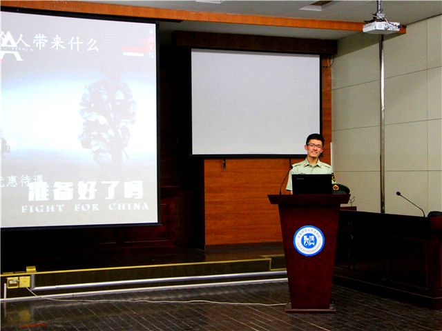 会议伊始,靖少鹏首先通过播放一段精彩的武警宣传片吸引与会人员的目光。紧接着,他就自身参军经历为我们详尽的阐述了两年服役生活的得与失。他指出尽管自己付出了两年的宝贵时光,但他收获了丰富的人生经验,他在改变自己思维方式的同时更是改善了自己的生活习惯。此外,他还详细的为我们介绍了参军的一系列流程以及自身经历的军营生活,他强调两年的服役生活令他:强健其体魄,野蛮其精神!