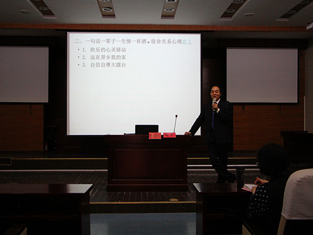 讲座上,赵平老师主要就大学宿舍关系的价值与呵护艺术做出分析。在寝室同学关系的价值上,赵老师分为人的本质、人际资本两个方面,从形上考量和形下考问的不同角度解读宿舍人际关系的心理意义和人才意义。他强调,大学宿舍关系不仅是丰富个性大讲台,更是自我成就展示台、人才浮出PK台。接下来,他按照现今老员工宿舍关系的现状、种类、问题归因和问题消解的顺序一一阐述讲解。他认为,大学宿舍关系是人际关系的重要组成部分,不管是个体关系还是群体关系,沟通都是解除障碍的直接要素,心理咨询也是明智的选择。同时,他也就沟通的技巧提出几条合理可行的建议。讲座的整个过程中,赵平老师以丰富生动的语言给同学们带来了一场强劲的心理上的风暴。同学们纷纷表示受益匪浅。