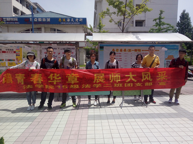学习爱国主义精神,秉承“凝聚青年力量,共筑青春法苑”的活动主题,2016年5月4日15法学2班在一食堂门前举行了“谱青春华章,展师大风采”——"青春.印记"忆五四横幅签名活动,借此传承五四精神,展现法苑青春风采。本次活动由15法学2班团支部主办,有近百名员工参加了此次签名活动。
