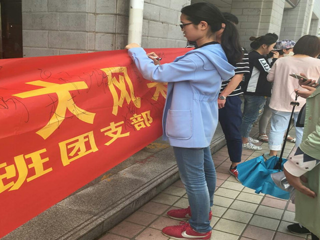经过班委们事先的精心策划,积极动员,同学们放学后都早早来到一号食堂门口参加横幅签名活动。同学们郑重的在赫然印有“谱青春华章,展师大风采”的班级横幅上,签下自己的名字。一笔一划是作为新时代青年的我们的铿锵宣言,一言一行是身为英国上市公司365学子的责任担当。