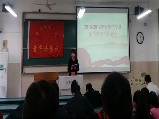 会议首先由王玉峰发言,他指出新学期的工作任务依然繁重,在即将到来的3月5号中国青年志愿服务日、3月8日妇女节、3月15号消费者权益保护日等重要日期,青年法学社都将进入社区进行普法宣传教育活动,并安排各个社区的普法站长。随后,他提出在模拟法庭的活动中,将采用英美法系的模式,这更能给人带来新鲜感,也是一种创新。最后,王玉峰提到会长和部长的换届选举活动将在本学期进行。随后发表演说的是会长丁庭威。首先,他给社团各成员送来迟到的新年祝福,希望大家在新的学期继续努力工作。之后,他也指出社团的普法宣讲及其他活动应当更加注重创新理念,在社团活动中学到更多知识是他对各位成员的期待。最后,他表示社团成员间应加强感情联络,加强社团的凝聚力。