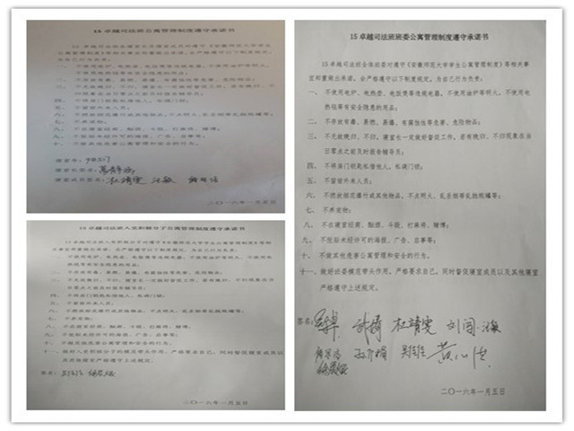 1月5日下午,15卓越司法班以寝室为单位签名《15卓越司法班公寓管理制度遵守承诺书》,承诺会严格遵守制度规定,为自己行为负责。同时,入党积极分子与班委签名《入党积极分子承诺书》与《班委承诺书》,承诺会严格要求自己的同时做好模范带头作用,督促其他同学遵守公寓管理制度。