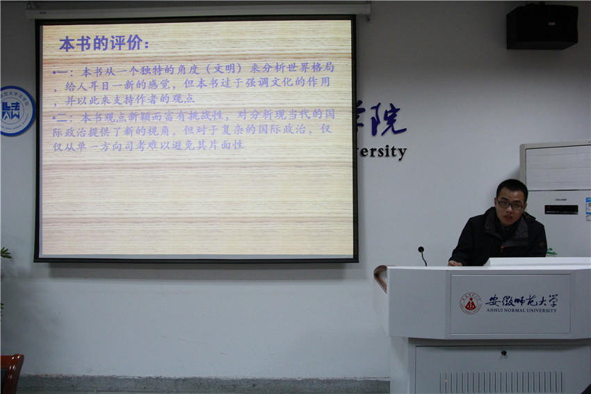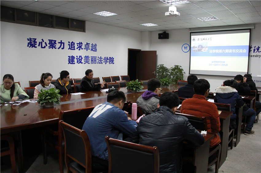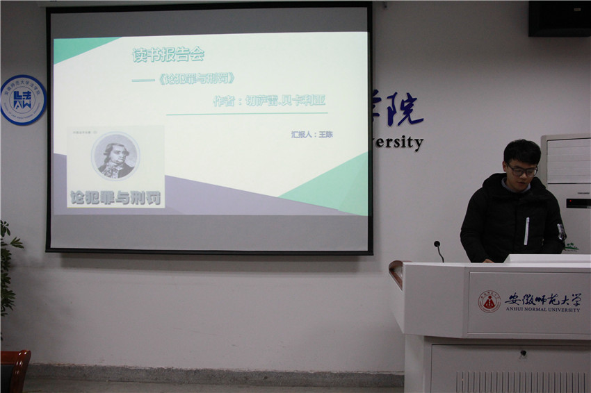 首先,由主持人介绍了评分细则。第一位汇报的是龚颖同学,她分享的书籍是《平凡的世界》,从作者、内容、主要人物、经典语句等方面着手,总结了泛读、精读、选读的读书经验,获得了要热爱生活、快乐度过每一天的启示;刘建伟同学就《文明的冲突与世界秩序的重建》一书发表了自己的看法,他肯定了作者的角度独特、新颖而富有挑战性,同时也提出了自己的主张,如过于强调文明的作用且对于文明的界定不清楚等;第三位汇报的是朱敏同学,他带着批判性思维详细介绍了《把信送给加西亚》的作者和内容,指出了书中宣扬的绝对忠诚的不合理性,又表明了应该“把信送给更好的自己”的思想主张;檀丹丹同学携《西窗法雨》压轴登场,她以书中的两个事例为切入点,对比西方与中国法律制度的异同,由浅至深,引人入胜,理性分析的思维值得我们学习;最后是由王陈同学为我们解读《论犯罪与刑罚》,他指出为了不使刑罚成为某人或某些人对其他公民施加的暴行,刑罚应该是公开的、及时的、必需的,在既定条件下尽量轻微的、同犯罪相对称的并由法律规定的,并结合我国现行法律,表明了我国应该对死刑在条件、对象、程序等方面进行限制的主张。