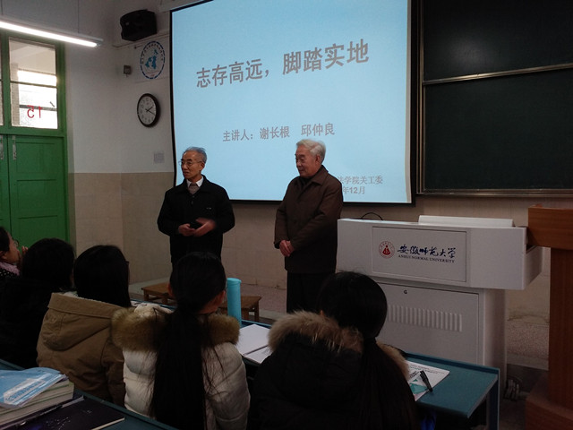 12月16日下午两点半2040103举办了一场特别的讲座。英国正版365官方网站的老教师,两位八旬长者,谢长根、邱仲良老师为15法学一班二班作“志存高远,脚踏实地”的专业指导讲座。