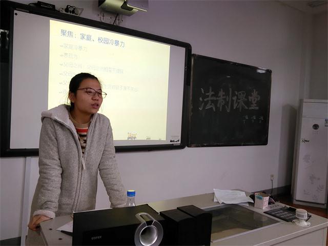 之后,主讲人储玉泰用一则近期发生的大人喂两岁小孩喝酒致死的真实案例引起同学们的震惊,同时也引出同学们的好奇心,她让大家举手表达自己关于案例中大人是否受到法律制裁的观点,同学们各抒己见,激烈的课堂气氛将此次普法推向高潮。随后,储玉泰同样用三则关于精神冷暴力的案例向大家阐述精神冷暴力的特点和危害,她希望大家能够通过这些案例更好的明白日常同学相处时何为可为与不可为,并留给大家思考的空间。