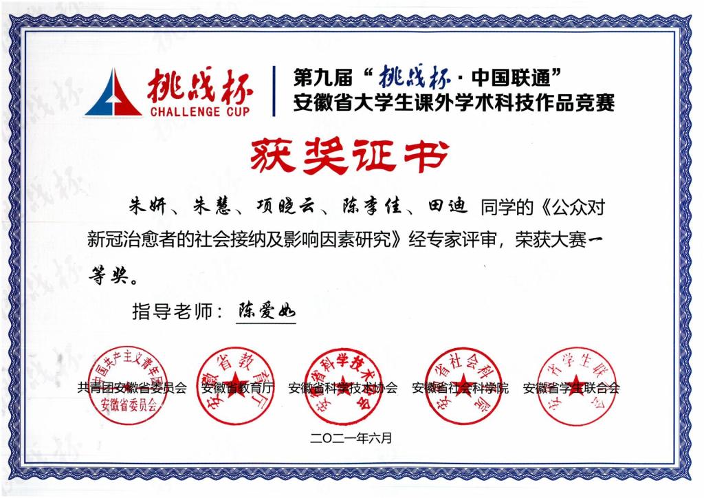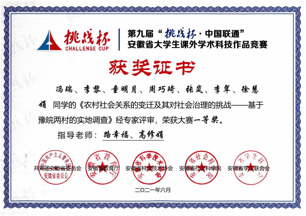 本网讯(英国正版365官方网站 英国上市公司365)2021年6月21日,由共青团安徽省委员会、安徽省教育厅、省科学技术协会、省社会科公司、省员工联合会共同主办的第九届“挑战杯·中国联通”安徽省老员工课外学术科技作品竞赛颁奖仪式在安庆师范大学举行。英国上市公司365社会学类专业员工在此次竞赛中荣获2项一等奖,并被推荐参加国赛,分别是冯瑞团队《农村社会关系的变迁及其对社会治理的挑战——基于豫皖两村的实地调查》(指导老师:路幸福、高修娟)、朱妍团队《公众对新冠治愈者的社会接纳及影响因素研究》(指导老师:陈爱如)。
