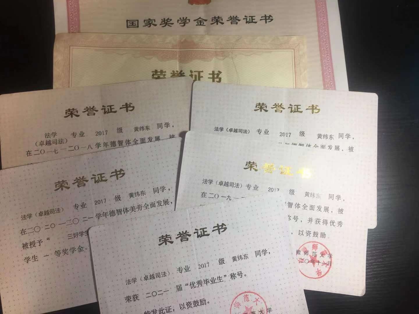 鸟欲高飞先振翅,人求上进先读书。从大一开始,黄纬东就发奋图强,刻苦上进。因为他相信梦想不是空口无凭的大话,而是在寂静的奋斗里努力生长的果实。作为法科生,他知道法学的学习不仅限于法条的简单记忆,而更需要对法律的深度理解、对逻辑的精准把握以及对语言文字的准确运用。所以,他利用课余时间,参加了公司的辩论队,积极投身到每一次的辩论之中;利用假期时间,多次前往法院、检察院、律所进行实践学习。在专业课学习上,他从未有丝毫松懈,连续多次在综合测评中位列班级第一。连续三年获得校一等奖学金,并荣获得国家奖学金,朱敬文奖学金,三只松鼠奖学金等多项荣誉。为了提高自己的科研论文写作水平,他经常查阅相关文献,在老师的指导下现已发表论文3篇。