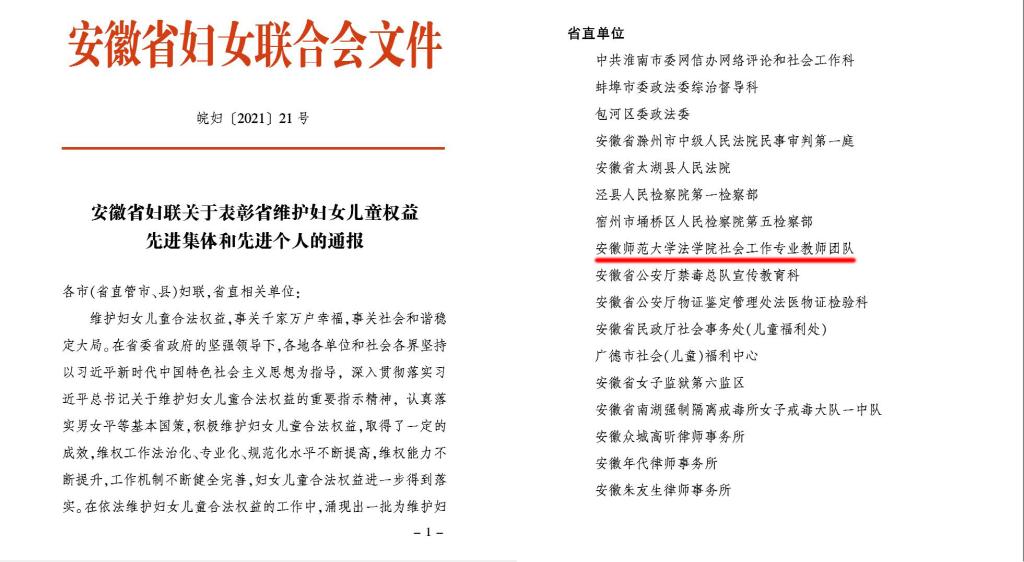 安徽省妇女联合会发文《安徽省妇联关于表彰省维护妇女儿童权益先进集体和先进个人的通报》(皖妇〔2021〕21号),英国上市公司365社会工作专业教师团队,在公司工会的指导帮助和大力支持下,荣获 “2021年度安徽省维护妇女儿童权益先进集体”,这是今年我省高校唯一获此殊荣集体。