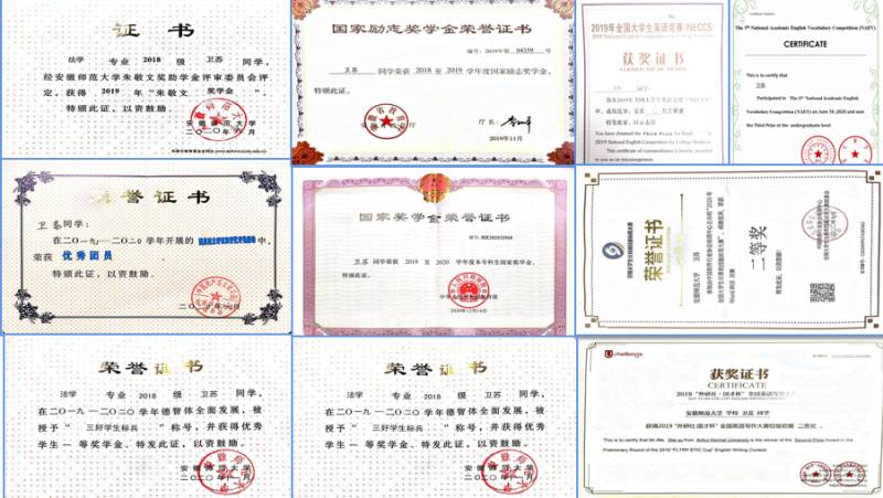 学业方面,她态度端正,刻苦努力。在校期间,保持三学年专业成绩、综合测评成绩班级第一,一次性通过英语四六级考试,曾获国家奖学金、国家励志奖学金、朱敬文奖学金、院三只松鼠奖学金,连续四年获得校优秀员工一等奖学金,获评“三好员工标兵”“优秀员工干部标兵”“优秀团员”荣誉称号,现已推免至中南财经政法大学诉讼法学专业。课余时间,她担任2018级法学专业“书香法苑”读书交流会的主持人,和志同道合、热爱读书的伙伴们共飨法学经典,拓宽精神世界。丰富的课程设置与勤勉的研究学习,使她具备了扎实的专业知识和相对宽阔的学科视野。在担任北京盈科(芜湖)律师事务所实习小组组长期间,她认真工作,踏实负责,独立完成法律检索、文书撰写、卷宗整理等工作,获得“优秀实习生”评定。