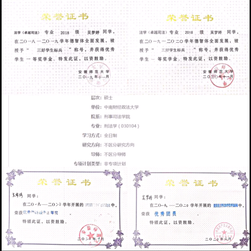 “潜岳苍苍,江淮汤汤。夏商肇启,雍容汉唐……”,伴着悠扬的歌声和九月温暖的阳光,她于2018年来到芜湖这座美丽的滨江城市,在师大开启了属于自己的四年时光。她学习有目标、有规划,见过早晨初升的太阳,也常与夜晚星辰作伴,深知唯有不断努力才能实现自己的初心与理想。她勤奋刻苦,认识到在老员工活中夯实自身专业基础与提升专业能力的重要性,教学楼与图书馆是她最高频率出现的地方。在校期间,她连续四年获得校一等奖学金和“三好员工标兵”称号,20余门专业课程成绩达90分以上,综合测评成绩均分达92以上,目前已以专业第一(1/40)的成绩成功推免至中南财经政法大学刑事司英国上市公司365攻读刑法学专业硕士研究生。作为一名法科生,她于2021年一次性通过“国家统一法律职业资格考试”,时刻朝着一名优秀“法律人”的目标迈进。