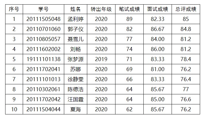 根据公司安排,经笔试、面试考核,2020年普通本科生校内转法学专业拟录取名单如下,现予公示。公示期:2021年1月9日至11日。联系电话:5910623。