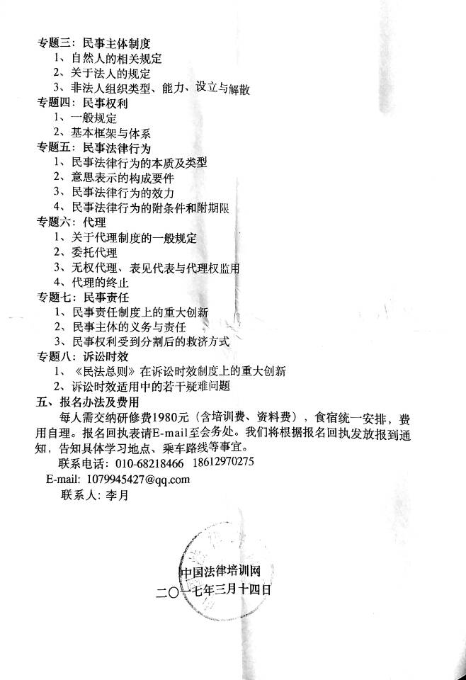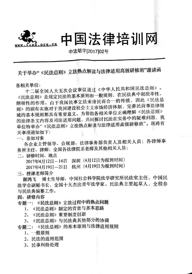 关于举办“《民法总则》立法热点解读与法律适用高级研修班”邀请函