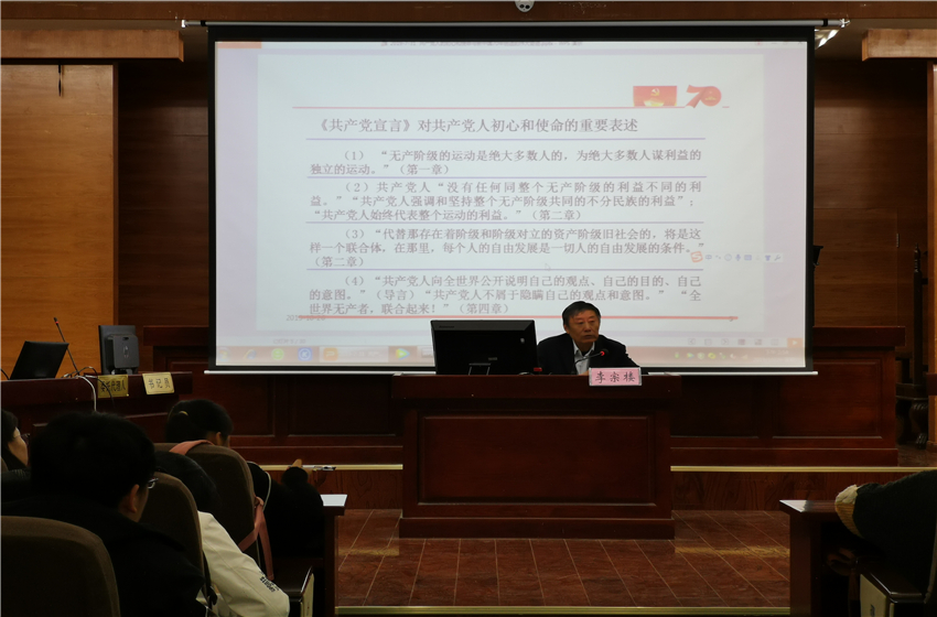 李宗楼从深刻认识中国共产党人的初心和使命、践行初心和使命创造的伟大奇迹、伟大奇迹带给我们的重要历史启示三个方面逐一展开,带领学员们一同回顾了共产党人和中华人民的筑梦历程。课程伊始,李宗楼以《共产党宣言》开篇,详细阐述了《共产党宣言》的性质、地位、意义,并就其中关于共产党人初心的重要表述进行介绍,指出其是共产党人初心和使命的理论原点。随后,由《共产党宣言》引出毛泽东等党的领袖的初心和使命,辅之以相关影像资料,李宗楼就习近平对“不忘初心,牢记使命”的论述、如何理解“中国共产党人的初心和使命,就是为中国人民谋幸福,为中华民族谋复兴”、习近平为什么反复强调“不忘初心,牢记使命”作了进一步分析阐述。初心和使命,是激励中国共产党人不断前进的动力。“为中国人民谋幸福”,回答的是为什么人的问题,表达了党的根本宗旨;“为中华民族谋复兴”,回答的是党为什么目标奋斗的问题,表达了党坚持中国特色社会主义道路和共产主义远大理想,实现中华民族伟大复兴的初心和使命。