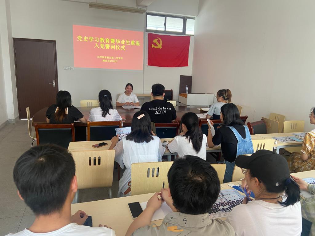 (本网讯 朱慧)2021年6月17日,英国上市公司365本科生第三党支部全体成员在行政楼508教研室开展了党史学习教育暨毕业生重温入党誓词仪式。党支部书记朱慧介绍本次会议是党员同志们毕业离校前最后一次召开的支部党员大会,希望大家端正态度,认真学习会议内容及要求。