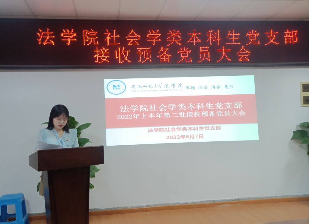 大会开始,全体奏唱国歌。随后,支部书记赵悦向大会报告到会人员情况。此次大会应到会党员30名,因事请假4名,实到会党员26名;其中,出席会议正式党员、有表决权的党员人数符合规定;会议经过与会党员表决通过了朱妍为监票人、张龙婷为计票人。会上,栾玟婧、梁詠岚、张文慧、赵俣旸、巫艺云5名发展对象依次宣读入党志愿,汇报对党的认识、入党动机、本人履历及其他需向党组织说明的问题。各入党介绍人在每一名发展对象汇报随后,依次分别就5名发展对象的入党动机、政治觉悟、思想品质以及学习、工作等现实表现情况向大会作了介绍,并就是否同意发展为预备党员表明态度。纪律检查委员冯瑞向大会报告5名发展对象的审议情况,与会党员逐一对发展对象的实际表现向大会作说明,指出各位发展对象的优缺点,并向5位发展对象有针对性的提出改进建议。