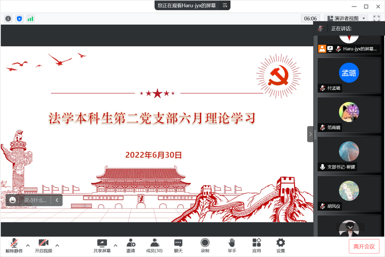 为进一步增强各党员同志的党性觉悟,法学本科生第二党支部于6月30日通过腾讯会议召开六月理论学习会。本次活动由支部书记崔健主持。支部预备党员金雨馨领学,全体党员参会。