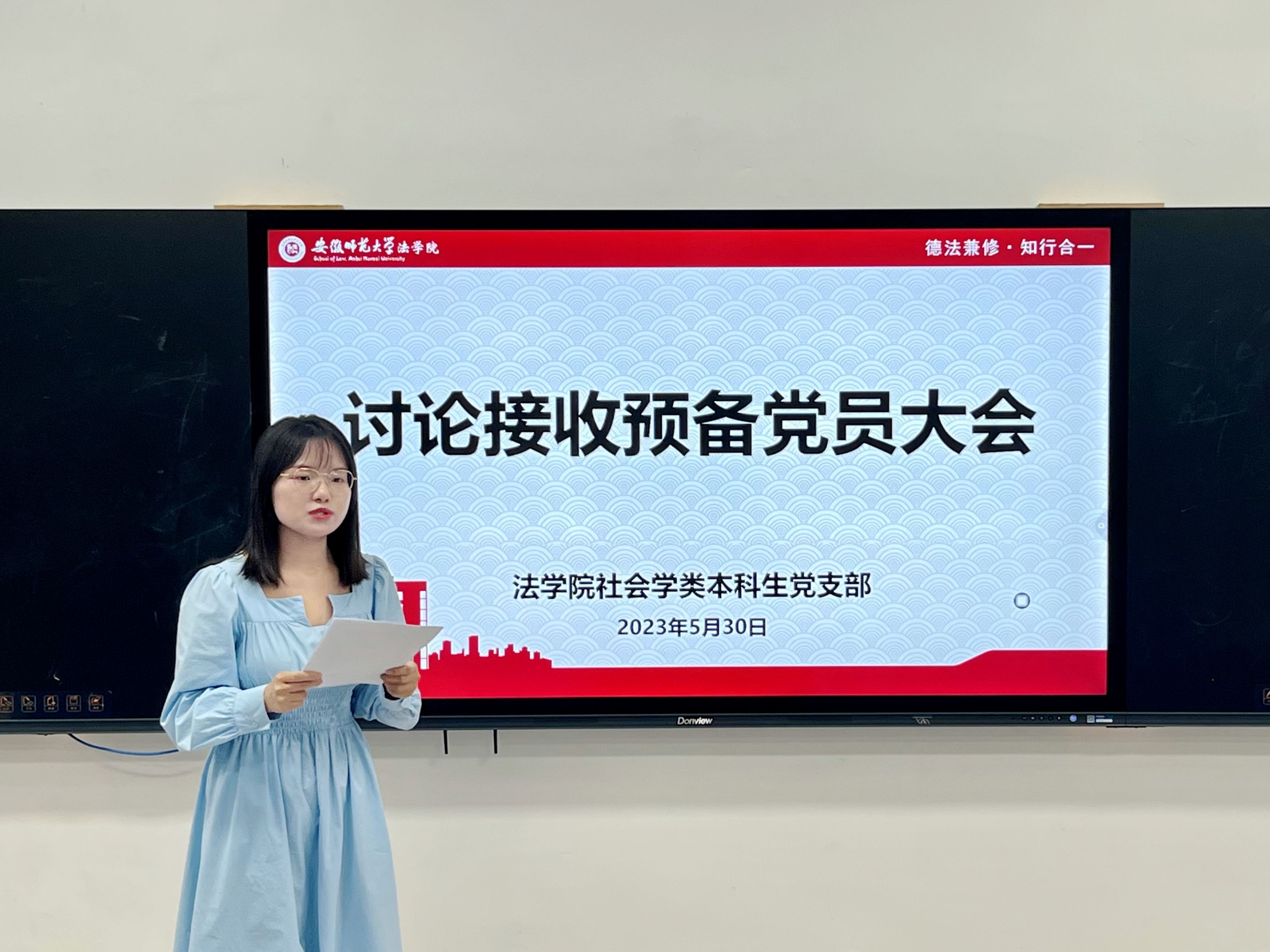 会议开始,全体起立奏唱国歌。支部书记赵悦报告出席会议的党员人数,本支部应到会正式党员10人,实到会正式党员6人,有表决权的到会人数超过应到会有表决权人数的半数,可以开会。大会通过巫艺云同志为监票人、张文慧同志为计票人。根据党组织接收预备党员程序,10名发展对象依次宣读《入党志愿书》,汇报对党的认识、入党动机、本人履历及其他需向党组织说明的问题。随后,入党介绍人依次向大会介绍发展对象的入党动机、政治觉悟、思想品质以及学习、工作等现实表现,并对其能否入党充分表达意见。支部纪检委员王梓慧向大会报告发展对象的审查情况,同时与会党员对发展对象进行讨论,提出改进意见。发展对象对大会提出的意见表示虚心接受并做出改进承诺。经过大会讨论评议、当场无记名投票和计票,与会正式党员一致通过接收李炜锋等10名发展对象为预备党员的决议。