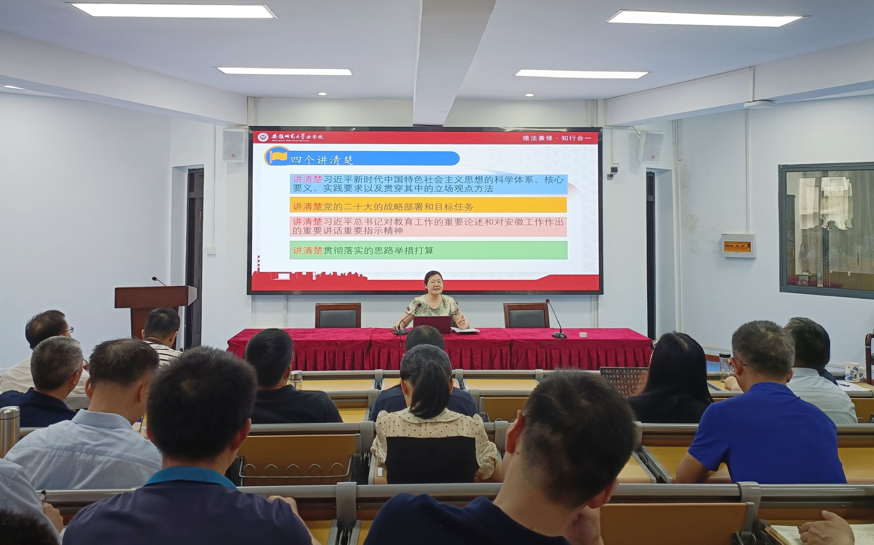 赵红采用PPT汇报方式,重点讲清楚四个部分内容,即:讲清楚习近平新时代中国特色社会主义思想的科学体系、核心要义、实践要求以及贯穿其中的立场观点方法;讲清楚党的二十大的战略部署和目标任务;讲清楚习近平总书记对教育工作的重要论述和对安徽工作作出的重要讲话重要指示精神;讲清楚贯彻落实的思路举措打算。