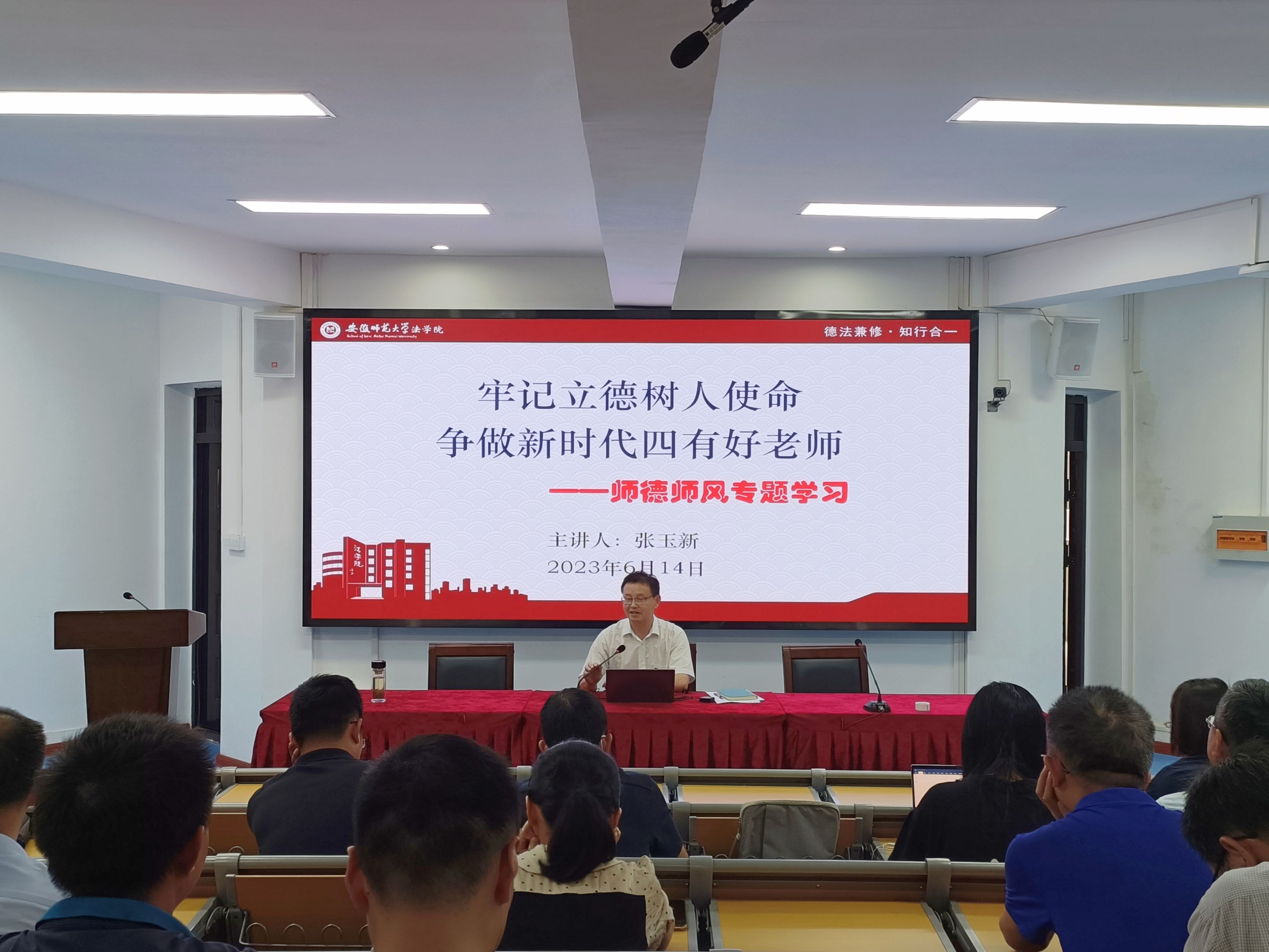 公司党委副书记、纪委书记张玉新带领全院教职工深入学习《新时代教师职业行为十项准则》、《安徽省高等公司教师师德失范行为处理办法(试行)》、《英国正版365官方网站教师师德失范行为处理实施细则(试行)》等文件,重点解读了高校教师师德失范行为负面清单,结合反面典型开展警示教育,指出高校教师要坚持以习近平新时代中国特色社会主义思想武装头脑、指导实践、推动工作,培育和践行社会主义核心价值观,自觉加强师德修养,严格遵守师德规范,严以律己、为人师表。