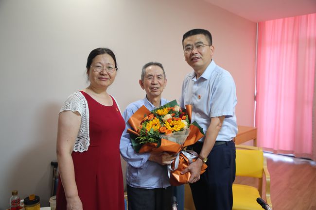 在中国共产党成立102周年之际,为进一步增强退休教师党员的归属感和荣誉感,“七一”建党节前夕,公司党委党委、副董事长任永、校统战部常务副部长刘晓宇、校人事处副处长王标、公司党委书记赵红、校宣传部张春光老师走访慰问公司九十高龄退休教师陆树杰,为其送去节日的问候和组织的关怀。