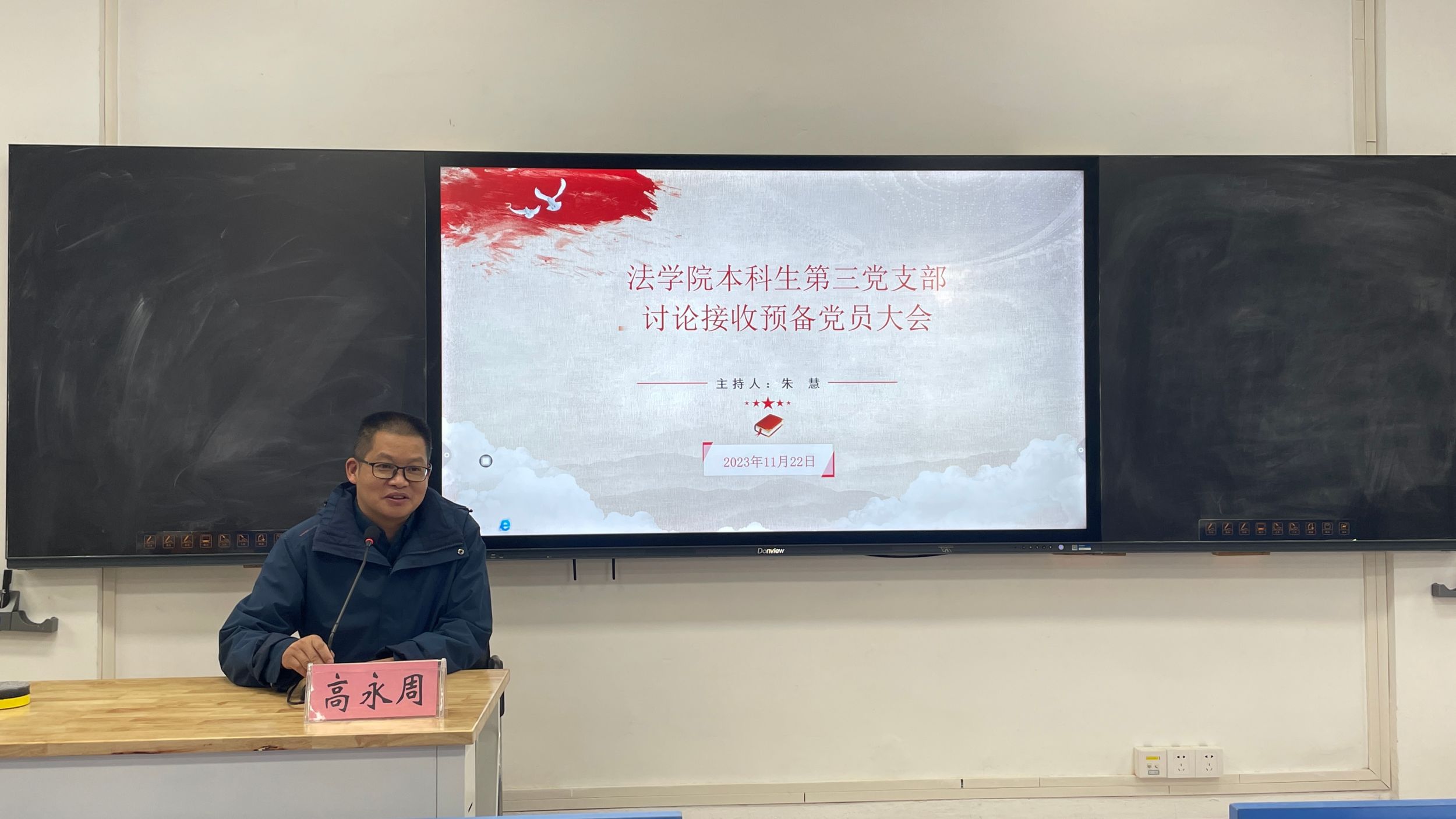 高永周作指导讲话,他对本次发展的六位同志表示祝贺,指出各位新发展同志要时刻牢记入党这一神圣而庄严的日子。党支部讨论接收预备党员是一项严肃的组织活动,党员同志应严肃对待;党支部也应严格遵守组织程序,高质量发展党员。同时,向各位党员同志提出了四点要求:一是明纪律,在学习和工作中遵守各项规定;二是懂敬畏,严肃对待加入党组织这一庄重事宜,谨言慎行;三是守初心,在未来的学习和工作生涯中铭记入党初心;四是发挥党员的先锋模范作用,努力在学业成绩、理论水平等方面起带头作用,时刻牢记党员身份。
