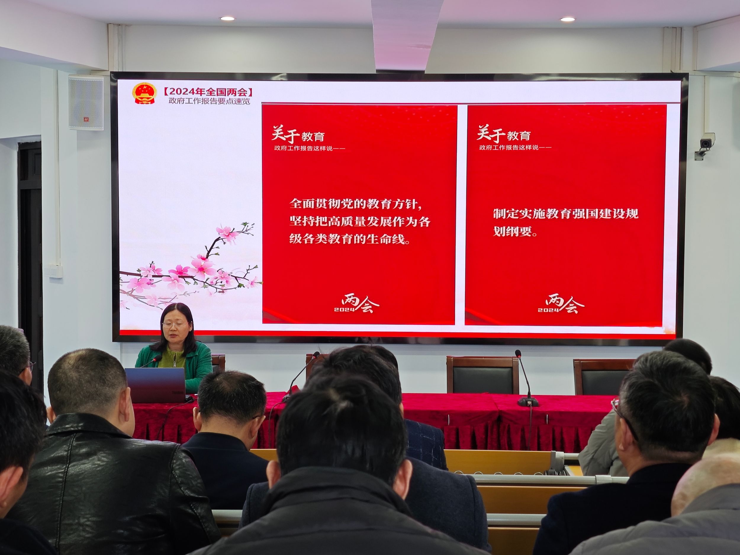 赵红指出,今年全国两会是在新中国成立75周年、实现“十四五”规划目标任务关键之年召开的一次重要会议,学习好、宣传好、贯彻好全国两会精神作为当前一项重大政治任务,要准确把握习近平总书记在全国两会期间重要讲话的丰富内涵、精神实质和实践要求。她以《2024年政府工作报告》为题,从过去一年的成就、2024年经济社会发展政策取向和2024年政府十大工作任务等方面,进行了深入浅出的解读,为全体教职工上了一堂生动的专题微党课。她着重强调了报告中有关教育的重要论述,如,“全面贯彻党的教育方针,坚持把高质量发展作为各类教育的生命线”“弘扬教育家精神,建设高素质专业化教师队伍”。