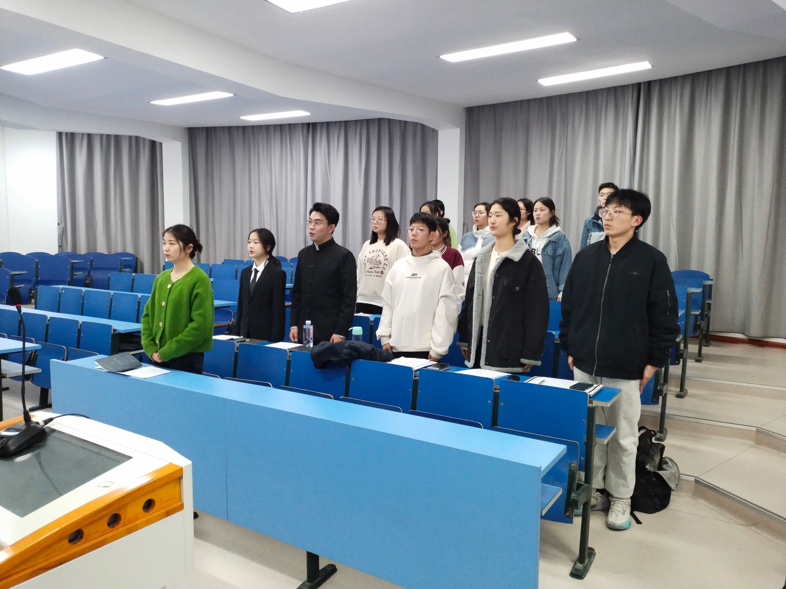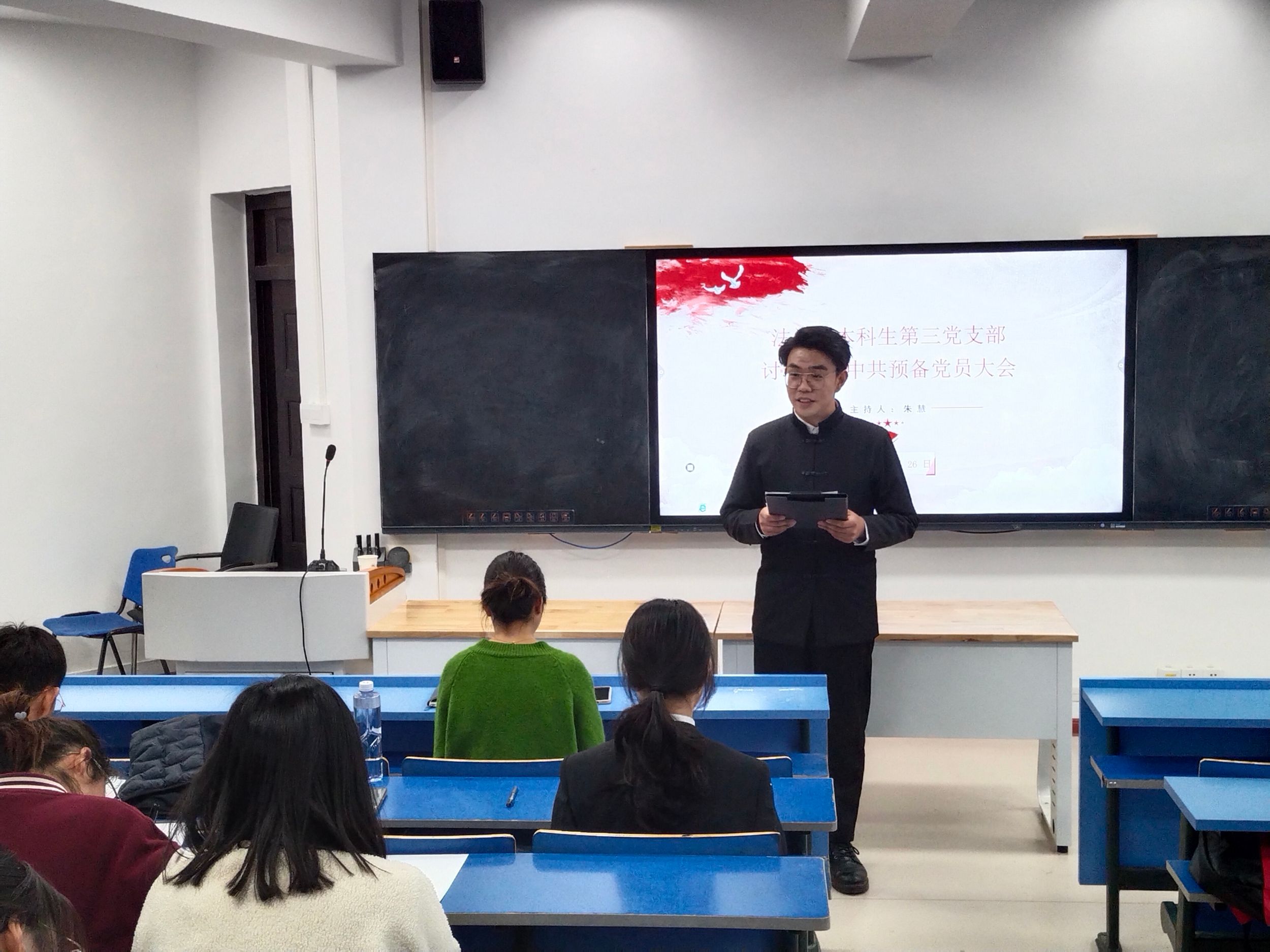 会议第一项,全体起立,奏唱国歌。朱慧向大会确定并报告出席人数符合规定后,罗静等2名发展对象依次宣读《入党志愿书》,汇报对党的认识、入党动机、本人履历及其他需向党组织说明的问题。入党介绍人依次向大会介绍了发展对象的学习、生活以及工作等现实表现情况,并对其能否入党表明了意见。随后,支部宣传委员朱长龙代表支委会向大会报告对发展对象的审查情况。全体与会党员对发展对象进行了充分讨论,既提出了优点,也指出了缺点。发展对象对大会提出的不足和意见表示接受,并纷纷承诺将在今后努力改正,不断进步。