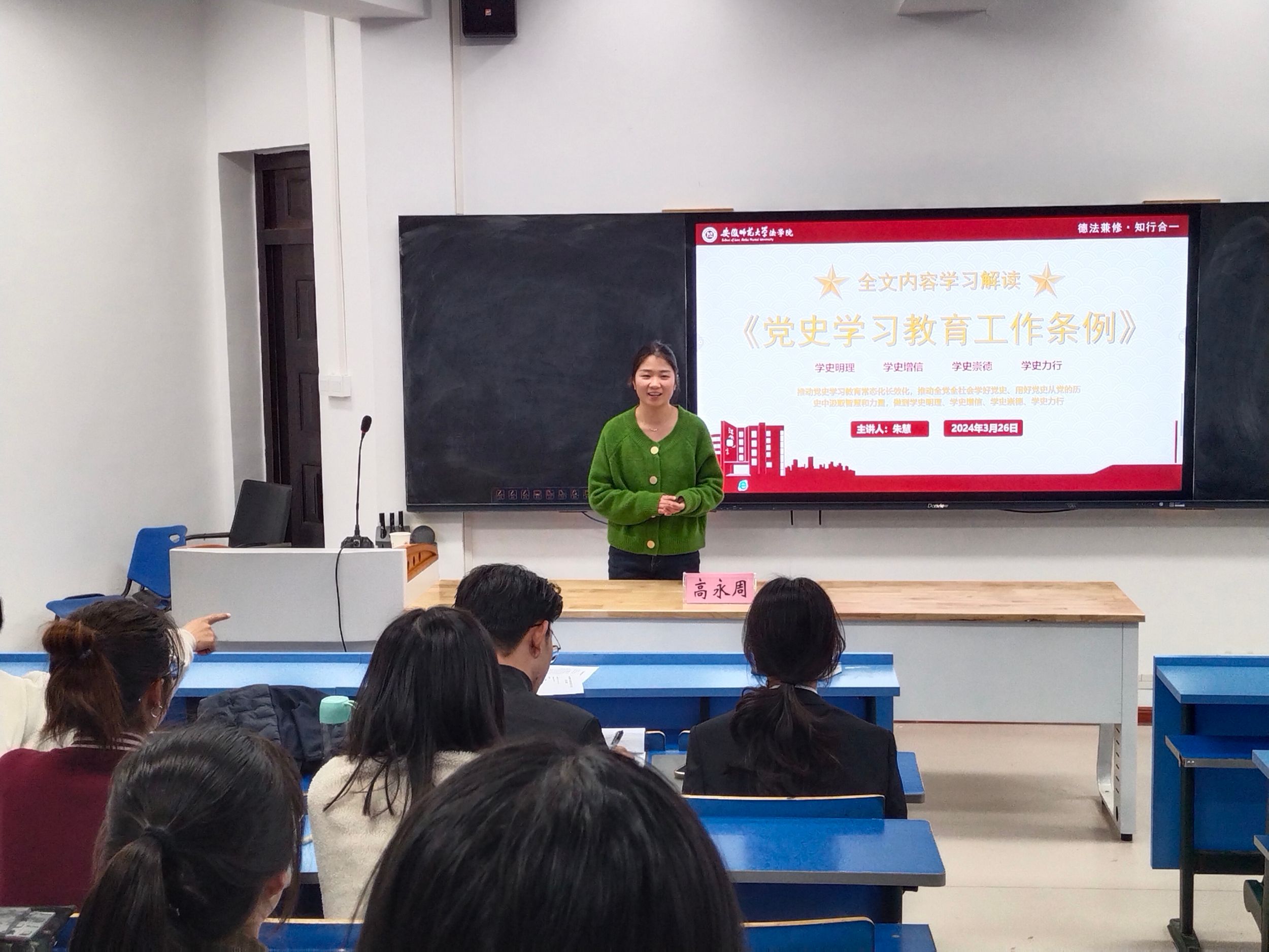 朱慧采用PPT汇报方式,分别从《条例》的背景及意义、重点内容、全文章节和贯彻落实四方面内容进行讲授。首先,朱慧带领大家认识了《条例》的背景及意义,让支部党员更加鲜明直观地认识到:《条例》是规范党史学习教育工作的基础主干党内法规;随后,朱慧着重讲解了在学习党史基本内容和宝贵历史经验、弘扬伟大建党精神以及树立正确党史观等方面,《条例》作出的正确规定;接下来,朱慧以条文规定为纲,带领支部全体党员有针对性地学习了《条例》的具体内容,着重选取了第三章《党史学习教育的内容》进行讲解,重点解释了“党史学习教育工作的主要任务”、“四个历史时期”、“中国共产党百年奋斗的十大经验”等内容;最后,朱慧向支部全体党员讲解了关于如何贯彻落实《条例》的内容,强调从党员个人的角度,应该把学习《条例》与贯彻落实党的二十大精神、学习领会习近平新时代中国特色社会主义思想、研读党内重要法规等相结合贯通,与时俱进加强理论学习。