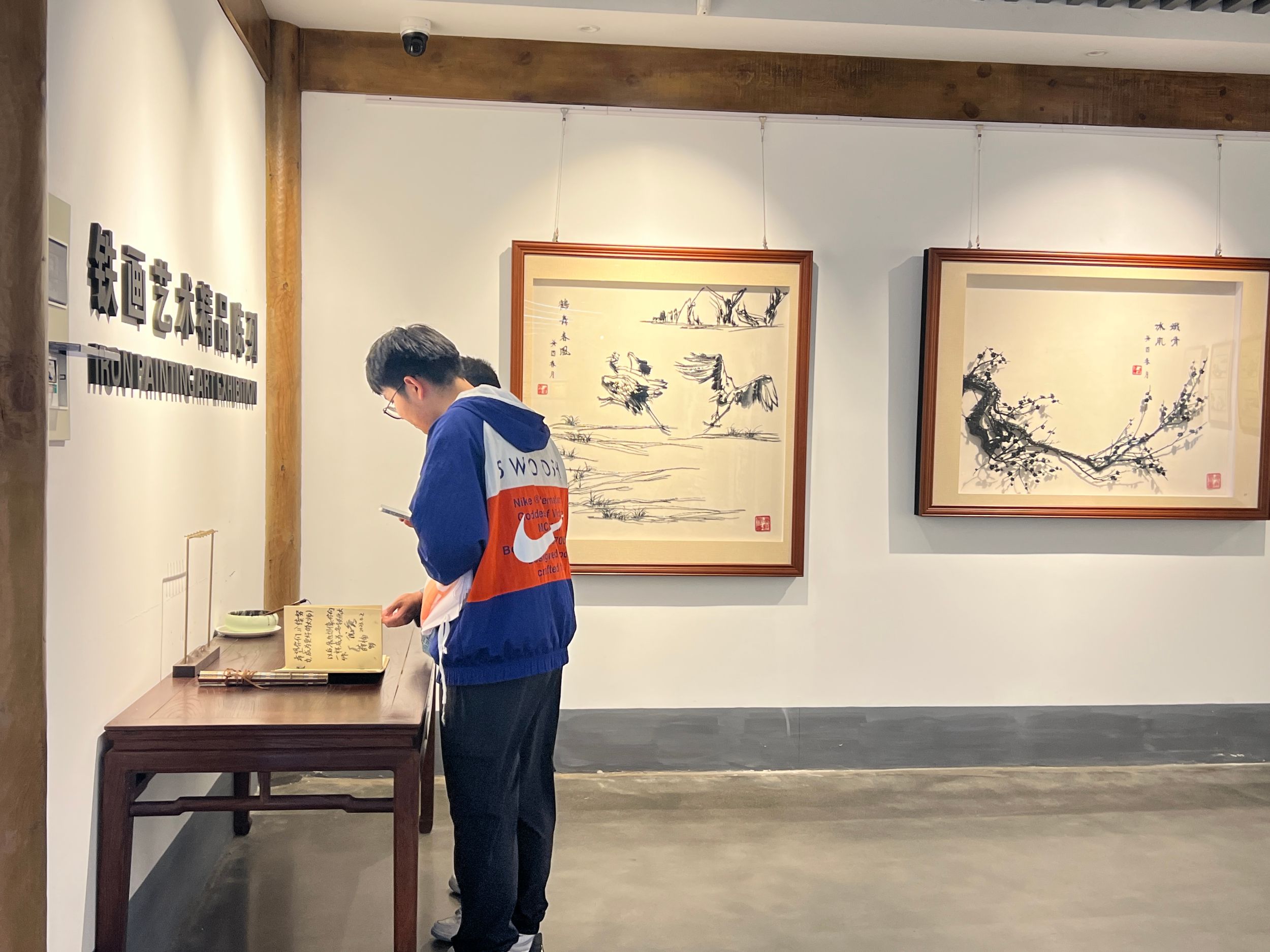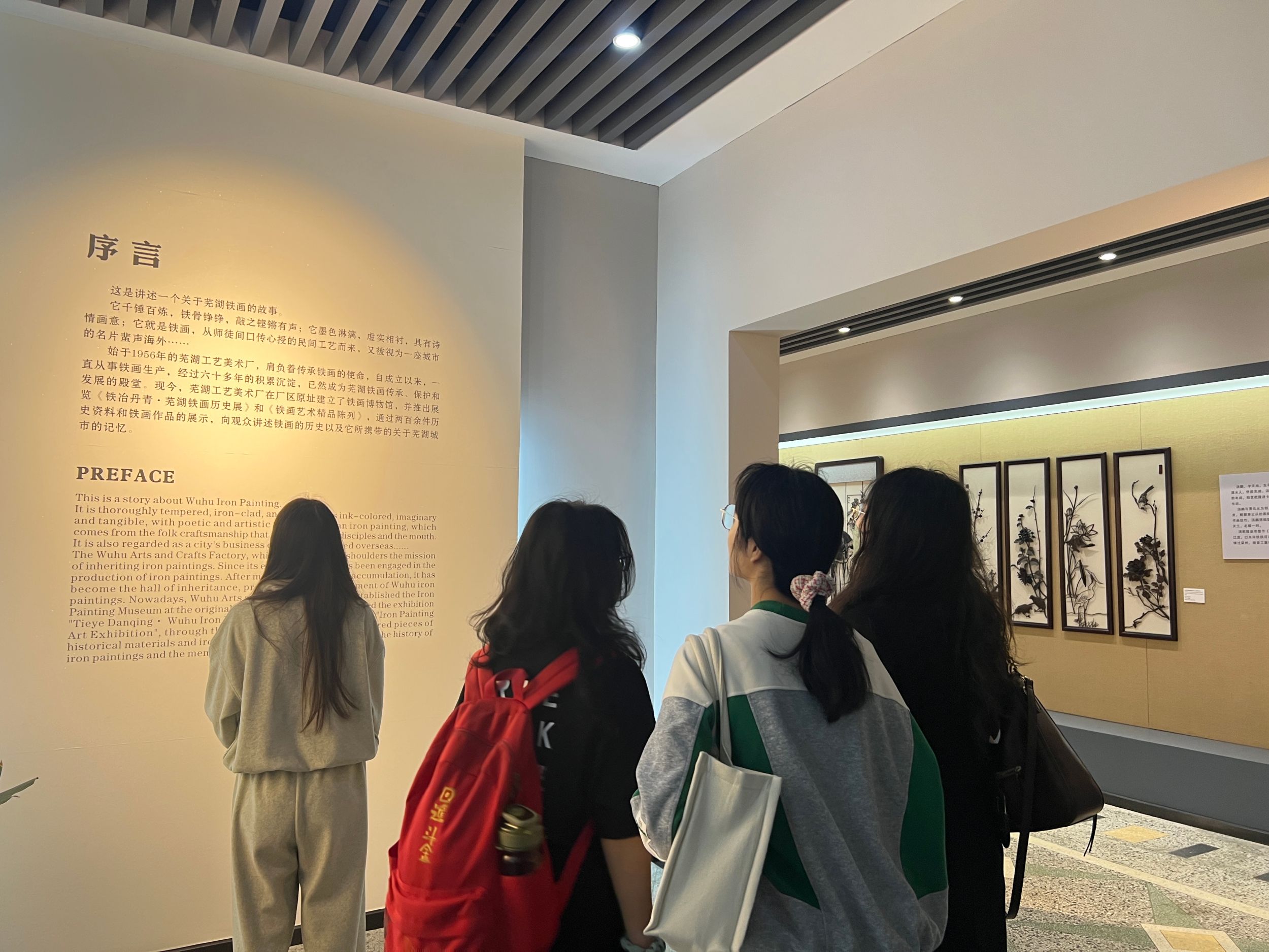 探寻历史渊源,谱写传奇故事。同学们由入口进入芜湖铁画的介绍概括,始于1956年的芜湖工艺美术厂,肩负着传承铁画的使命,自成立以来一直从事铁画生产,经过六十多年的积累沉淀,在一代又一代老艺人们的不懈努力下,谱写出了芜湖铁画的传奇故事。同学们感悟芜湖铁画以铁为墨,以锤为笔的非遗传承锻造技艺。