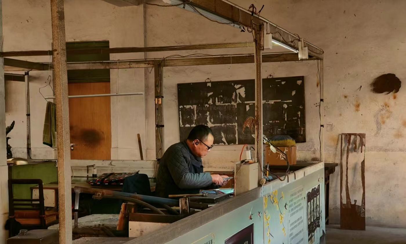 筑匠心之神,传不朽匠魂。最后,同学们移步至师傅们的工作室,在锻造间里可以看到铁画的制作过程。铁画以熟铁为原料,经过红炉加热后用锻、钻、抬、压、焊、锉、凿等技法制成。最终形成了既有国画的神韵又有雕塑的立体美的独具一格的艺术品。同学们从锻造师傅的身上感受芜湖非遗的保护和传承,感悟“大国工匠”的精神,为非遗红色文化传播搭建平台,贡献力量。