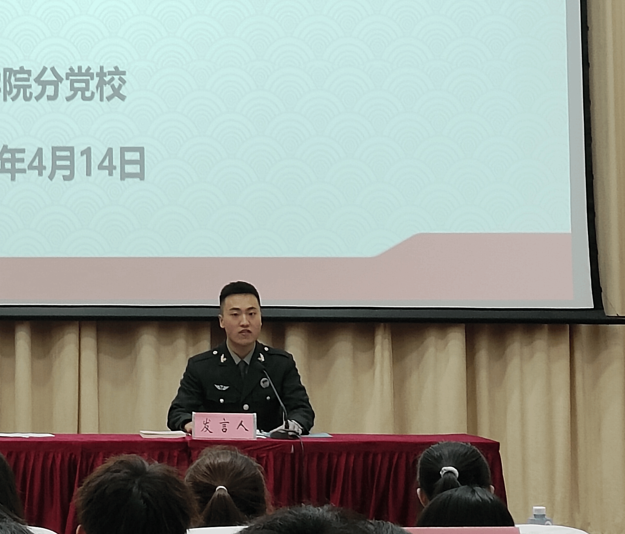 培训班学员代表2023级法学专业王令帅发言。他以退役复学老员工的身份,讲述了自己从军营生活的磨砺到回归校园的学习,感受到学习为本和团结聚力的重要性,表示在此次培训过程中要坚定理想信念,坚守初心使命,保持纪律作风。