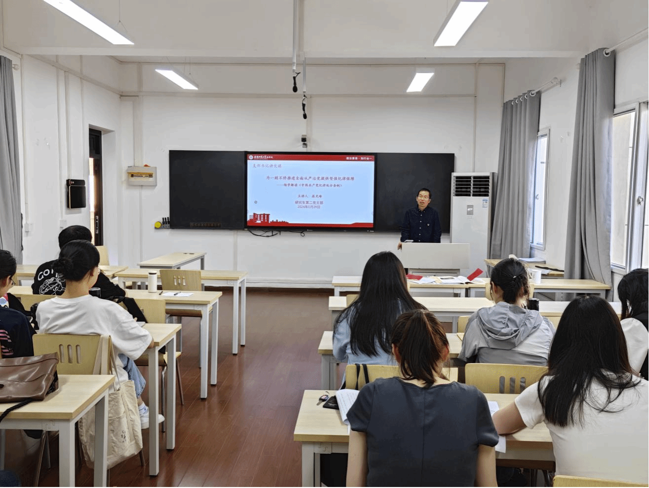 会议第三项,开展支部书记讲党课活动。支部书记屈光峰作题为《为一刻不停推进全面从严治党提供坚强纪律保障——领学解读<中国共产党纪律处分条例>》的专题党课,从为什么学、学什么、怎么学、怎么干四方面讲授, 鼓励各党员同志学纪知纪明纪守纪,做到知行合一,在推进“三大行动计划”、毕业生文明离校中持续发挥先锋模范作用。