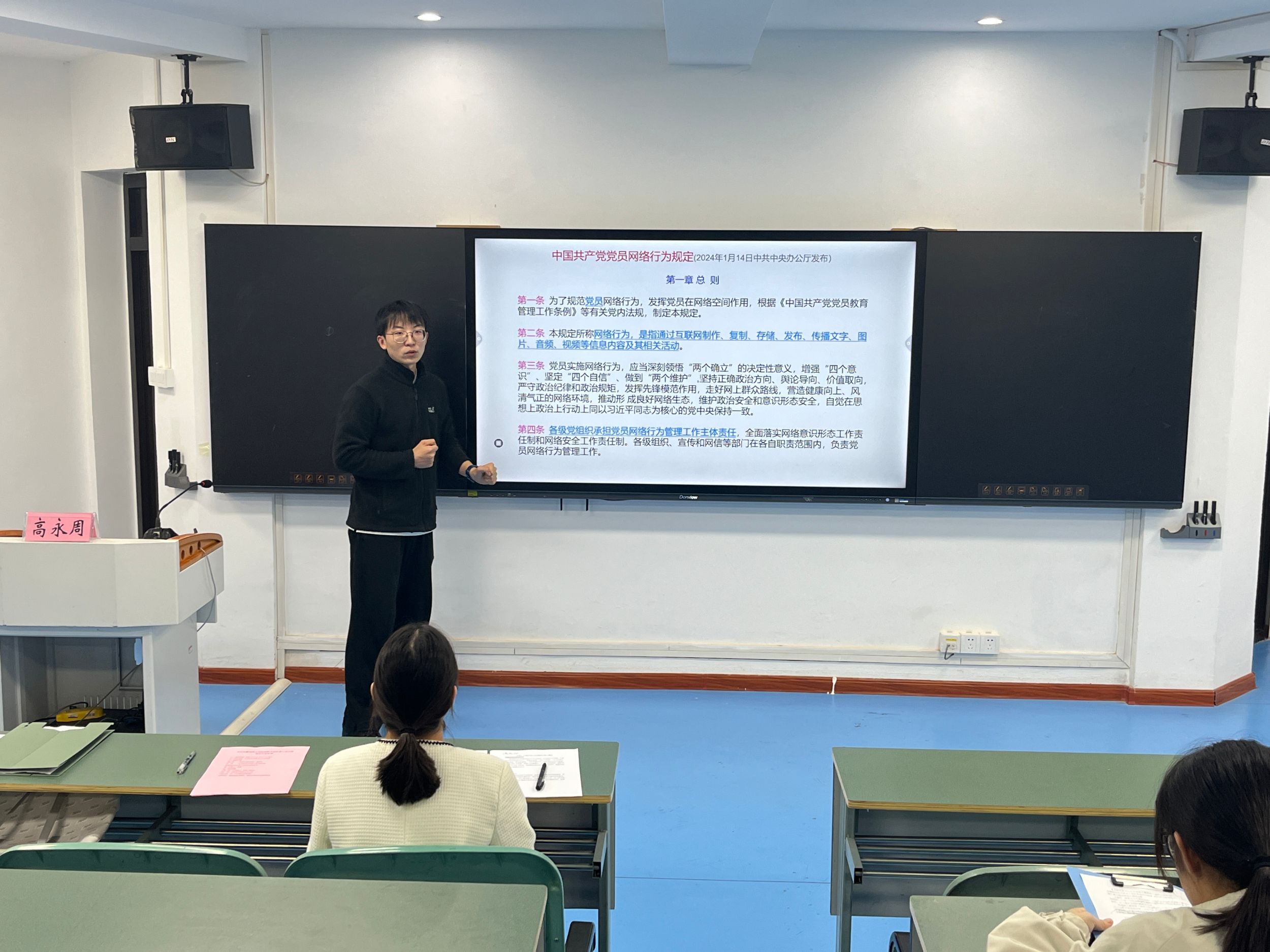 会上,张宇瑶带领大家学习了习近平总书记在中共中央政治局第十七次集体学习时的重要讲话。张宇瑶指出,这一讲话为新时代文化建设指明了方向,我们要深刻领会其精神实质,推动文化建设不断迈上新台阶。随后,徐如馨传达了习近平总书记在省部级主要领导干部学习贯彻党的二十届三中全会精神专题研讨班开班式上的重要讲话。习近平总书记强调,全体党员干部要深刻认识改革的重要意义,积极投身改革实践,为推动经济社会高质量发展贡献力量。接着,唐骏一为大家解读了《中国共产党党员网络行为规定》。该规定对党员在网络空间的行为提出了明确要求,旨在规范党员网络言行,维护党的形象和利益。最后,钟雯沛结合省委常委会会议精神,并以此为依托专题学习了习近平总书记考察安徽时的重要讲话,强调我们要切实把思想和行动统一到讲话精神上来。