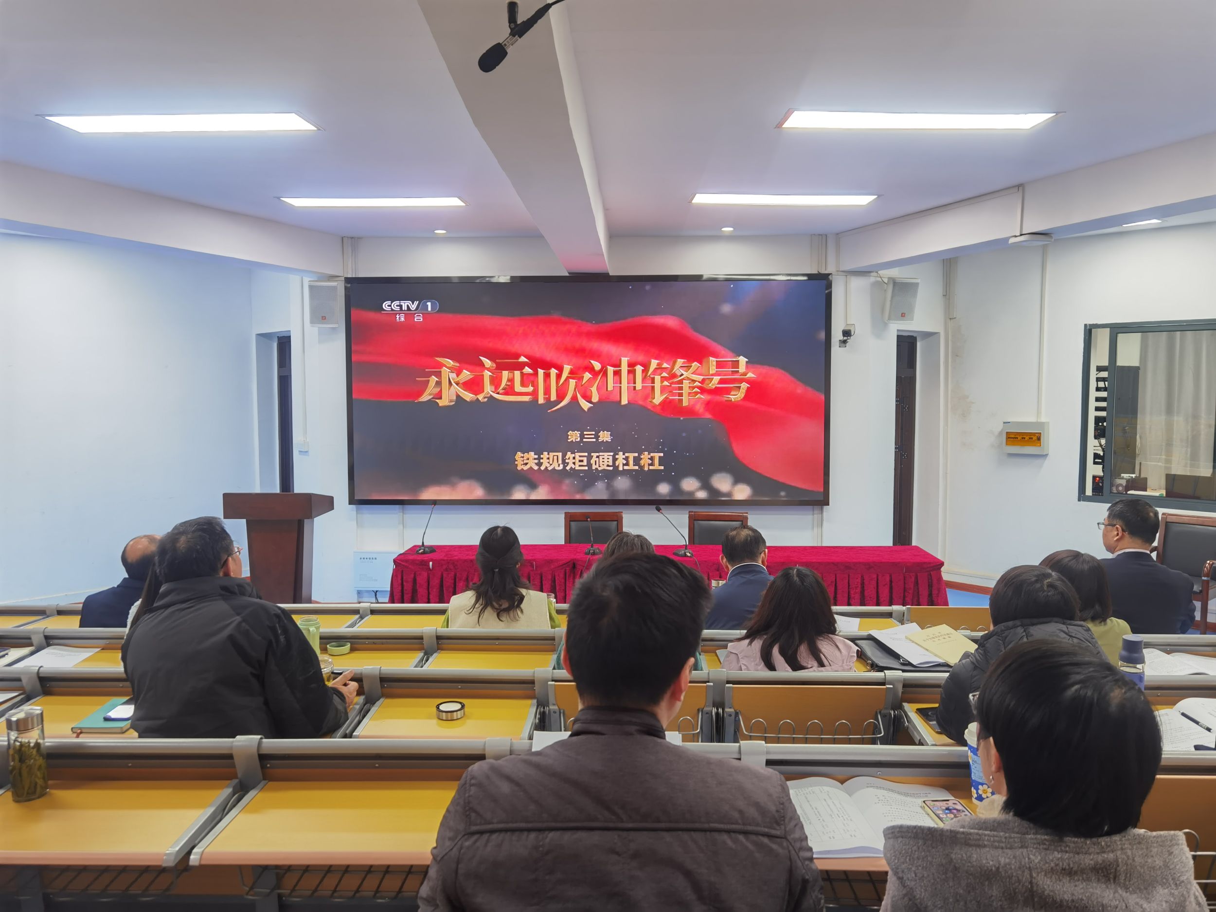 公司党委深入贯彻中央八项规定精神学习教育专题读书班开班式暨党委理论学习中心组(扩大)理论学习会重点开展警示鉴学活动。与会人员集中观看电视专题片《永远吹冲锋号》第三集《铁规矩硬杠杠》。