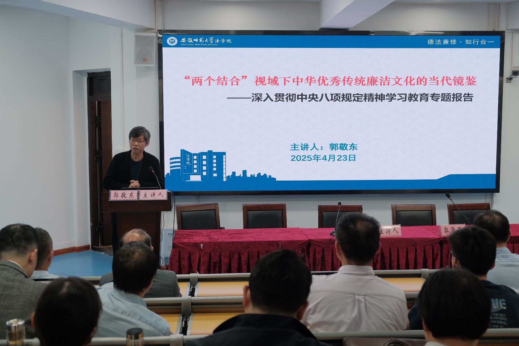 郭敬东从分享中央纪委国家监委网站上的2个反面典型案例入手,解读了中央八项规定的主要内容和中央八项规定精神的基本内涵。他指出,违反中央八项规定精神的具体表现为形式主义、官僚主义问题何享乐主义、奢靡之风问题两大类。郭敬东通过梳理包拯、海瑞、子罕等历史名人廉洁自律的事迹,概括了中华优秀传统廉洁文化中“正己、慎独、俭朴、奉公、无私”等5个重要价值理念。郭敬东指出,通过对这些价值理念的创造性转化,赋予其新的时代内涵,可以为高校教师深入贯彻中央八项规定精神提供重要驱动力。