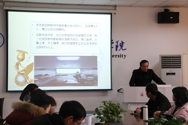 述职大会上,各支部书记结合自身特点,利用幻灯片全面总结了支部一年以来深入贯彻落实十九大精神、支部标准化建设以及支部战斗堡垒作用发挥取得的成效。公管支部周仁标老师在述职中着重展现了2018年教工支部在公司党委指导下将党建与教学、科研相结合、协同推进,在推动事业发展上找准结合点。法学(专升本)党支部书记黄世凯老师在述职中总结了党员在入学教育等活动中的优良表现;2016级研究生党支部书记胡桂芳老师展示了毕业办党员在求职、就业等工作发挥的先锋模范作用。同时,各支部也客观、真实地梳理了支部党建的重点工作,查摆了支部党建工作中存在的问题,分析了原因,并明确了下一步努力的方向。