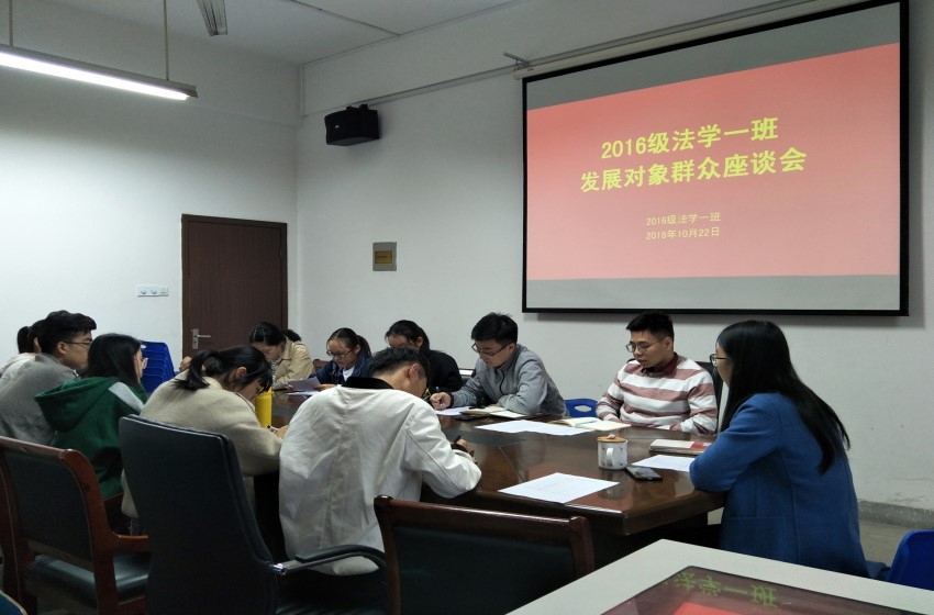 10月22日,2016级法学一班、二班在院行政楼五楼公管系教研活动室召开党员发展对象答辩暨群众座谈会。20位候选人以及部分预备党员、班委、团小组组长、候选人室友等员工代表共同参会,会议由辅导员储梦凡主持。