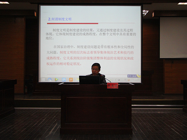 张正光主要从三个方面对讲座主题进行了阐述。首先,张正光向党员们介绍了制度与制度文明的概念,并指出今日所讲制度为在一定历史条件下形成的政治、经济、文化等方面的体系,即从宏观方面剖析国家社会制度。张正光分析指出,制度是随着时代的发展不断变迁演化的。史实证明,人民代表大会制度与马克思主义指导下的先进文化建设才是符合我国国情的政治与文化制度,并在社会主义现代化建设中发挥了巨大的推动作用。