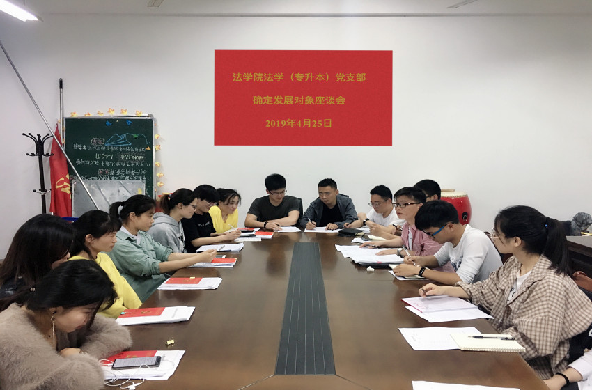 4月25日晚上,法学(专升本)党支部在行政楼305会议室召开确定发展对象座谈会。符合发展对象条件的15名入党积极分子以及11名代表共同参会,会议由支部书记黄世凯主持。
