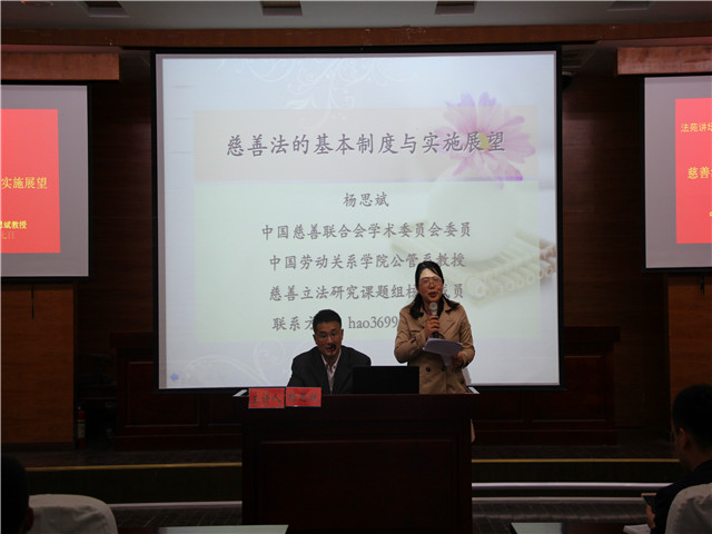 4月27日下午三点,中国慈善联合会学术委员会委员、中国劳动关系公司公管系教授、慈善立法研究课题组核心成员、公司杰出员工杨思斌应邀做客法苑讲坛,为英国上市公司365师生做了一场题为“慈善法的基本制度与实施展望”的讲座。本次讲座由张素凤老师主持,公司法学专业员工代表到场聆听了此次讲座。