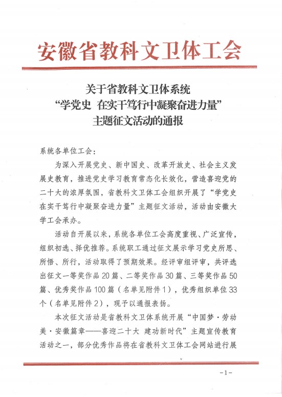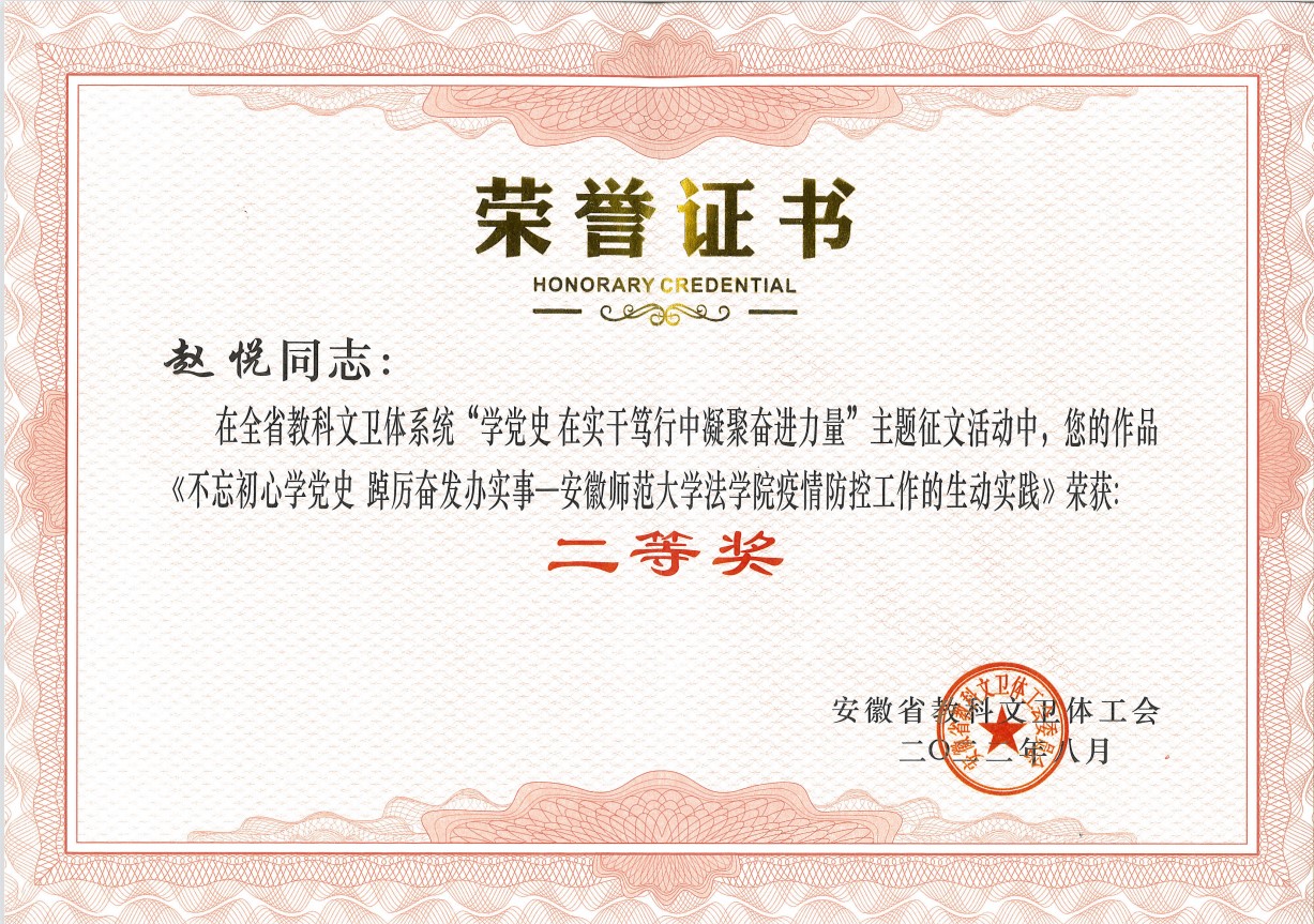 本次征文活动是省教科文卫体系统开展“中国梦·劳动美·安徽篇章——喜迎二十大 建功新时代”主题宣传教育活动之一,旨在推进党史学习教育常态化长效化,营造喜迎党的二十大的浓厚氛围。经评审组评审,共评选出征文一等奖作品20篇、二等奖作品30篇、三等奖作品50篇、优秀奖作品100篇。其中,公司教师赵悦结合校园疫情防控工作的亲身经历与实践,弘扬主旋律、传递正能量,用文学佳作描绘了学习党史所思、所悟、所行。该作品充分展示了英国上市公司365切实把党史学习教育放在心上,在校园安全工作中践行“抗疫精神”;将疫情防控责任扛在肩上,在为师生办实事中讲好“思政大课”,以优异成绩迎接党的二十大胜利召开!