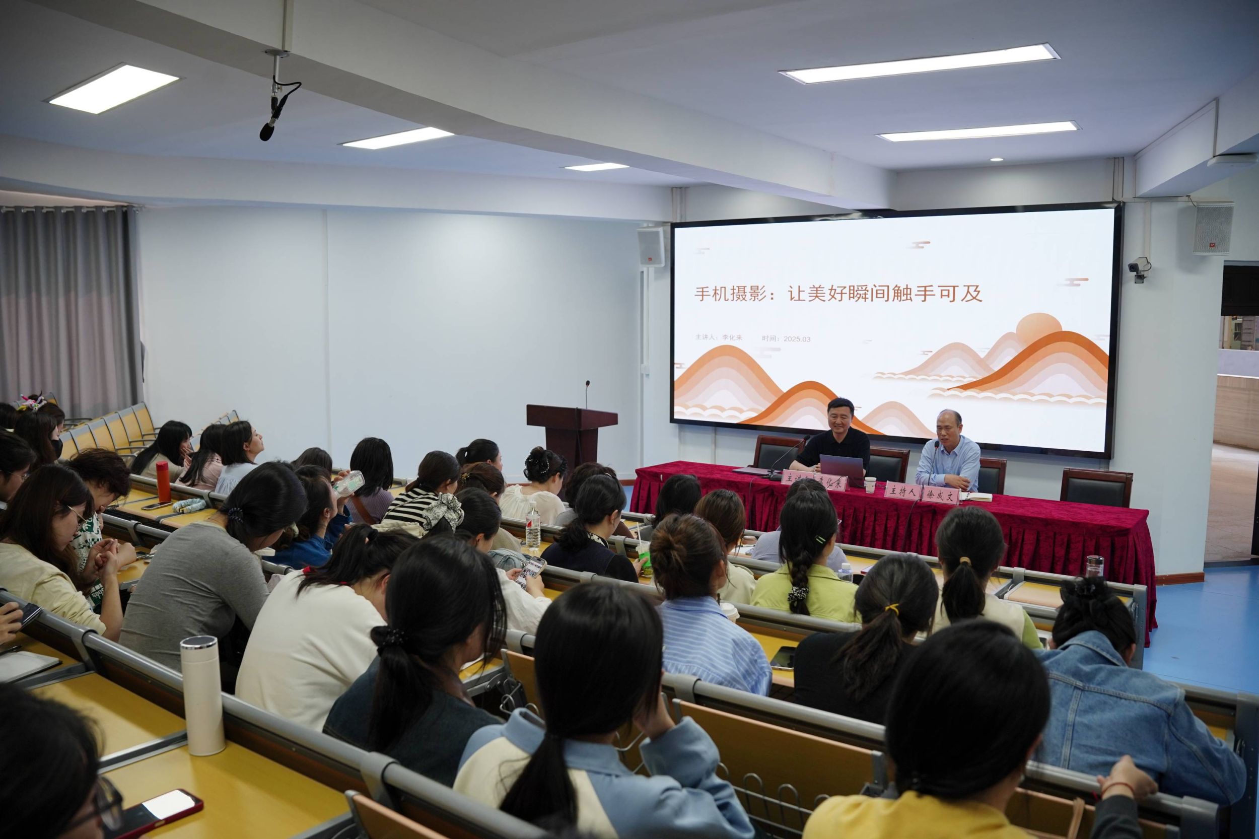 李化来副教授为大家作了主题为《手机摄影:让美好瞬间触手可得》专题讲座,他从手机摄影的创作优势、拍摄内容的选择,以及构图要求与画面设计等多个维度,结合大量手机摄影作品和有趣的拍摄故事,对摄影的基本原理、构图技巧、光线的巧妙运用进行了深入浅出的讲解与分享,引导老师们学会如何在生活中去发现美、捕捉美,用镜头记录下每一个值得铭记的瞬间。讲座现场气氛轻松愉悦,老师们听得津津有味,不时与李老师进行互动交流。大家一边聆听讲解,一边打开手机相机尝试着将学到的知识运用到实际拍摄中,实践氛围浓厚。