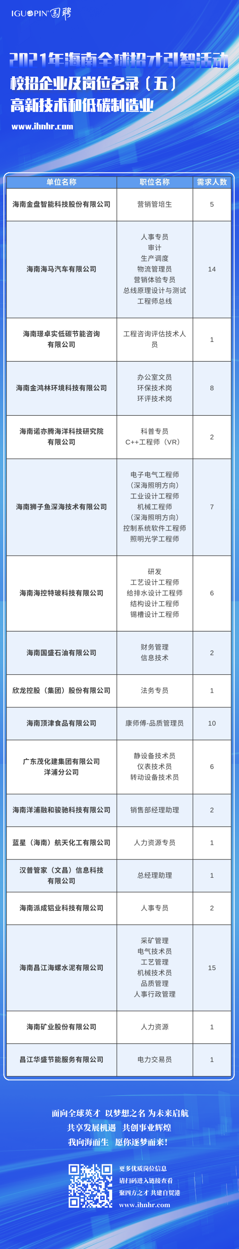海南自贸港招才引智 | 校招岗位名录(五)高新技术和低碳制造业