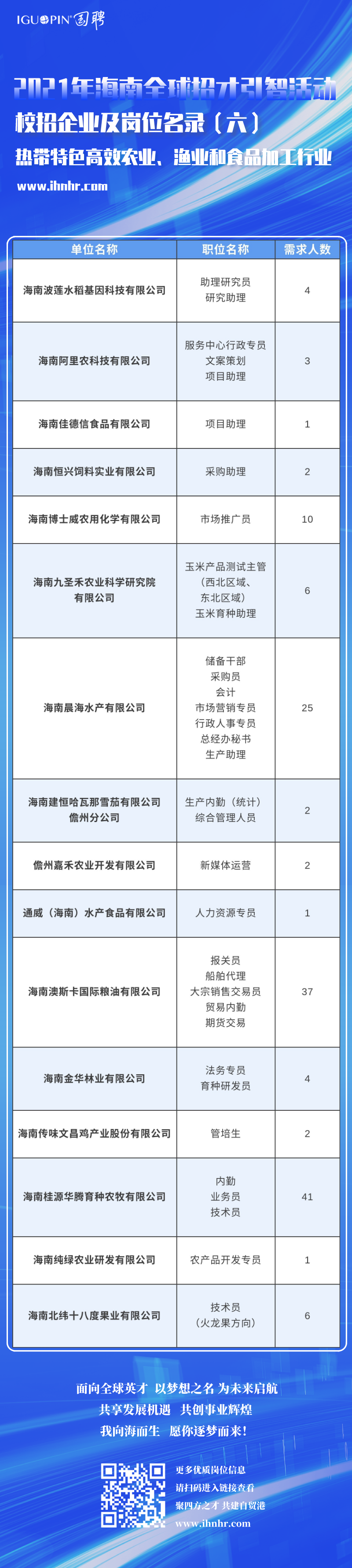 海南自贸港招才引智:热带特色高效农业、渔业和食品加工行业