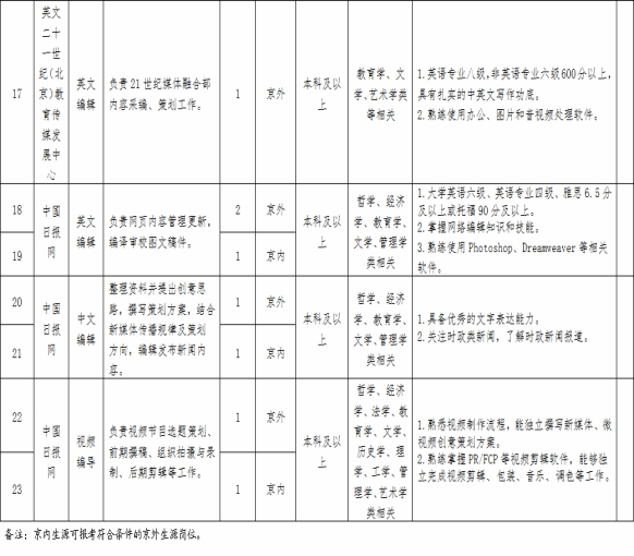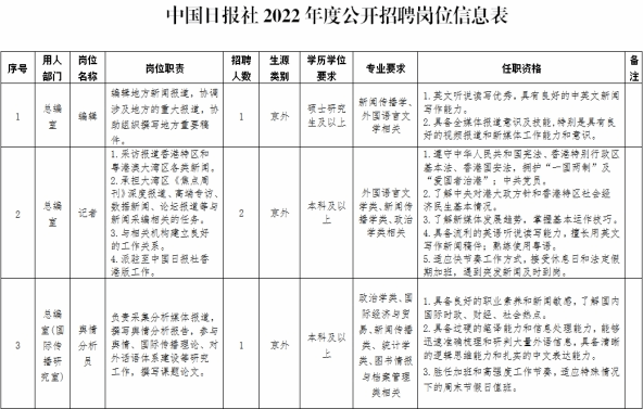 此次招聘涉及23个岗位、计划招聘25人,具体岗位及资格条件详见《中国日报社2022年度公开招聘岗位信息表》。其中,有关岗位专业条件参考教育部公布的专业目录(《普通高等公司本科专业目录》和《授予博士、硕士学位和培养研究生的学科、专业目录》)。报名应聘人员在报名时对专业有任何疑问的,可以直接拨打报名咨询电话进行咨询了解。